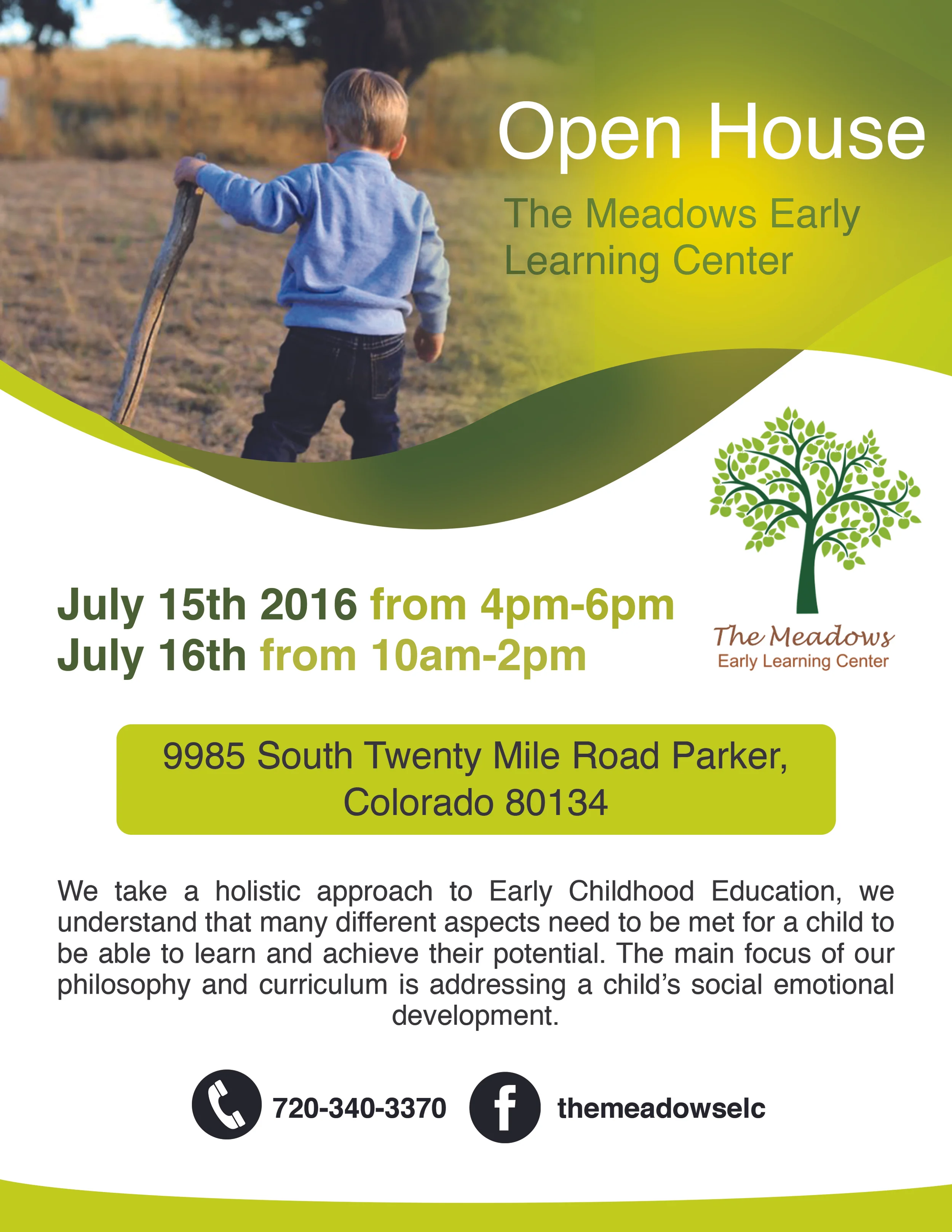 Open House Saturday, July 16, 2016 10:00 AM 2:00 PM The Meadows Early Learning Center 9985 South Twenty Mile Road Parker, CO, 80134 United States (map) Google Calendar ICS Come join us for day 2 of our Open House! Take a tour of the building with Captain America, Superman or Elsa! Meet Wonderland Balloons an amazing balloon artist, hang out with the Fire Department or much on some amazing food truck grub!